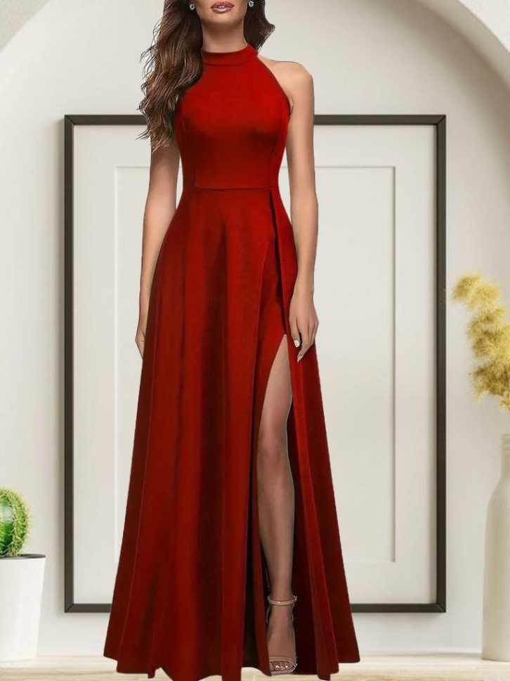 дамска рокля дълга с цепка J72116 червена