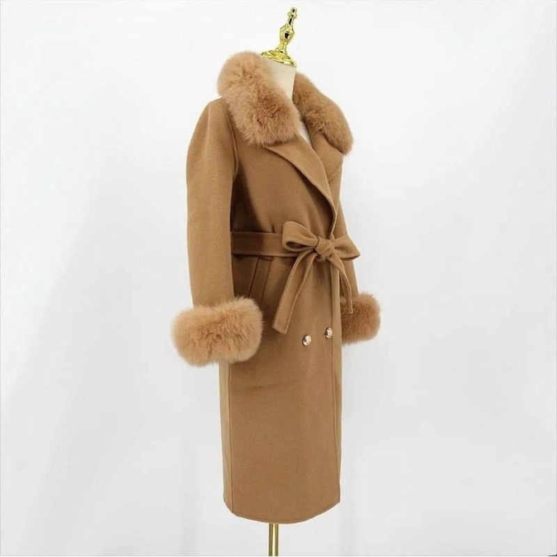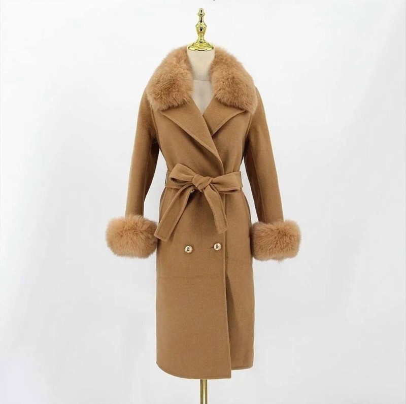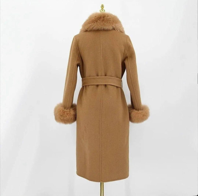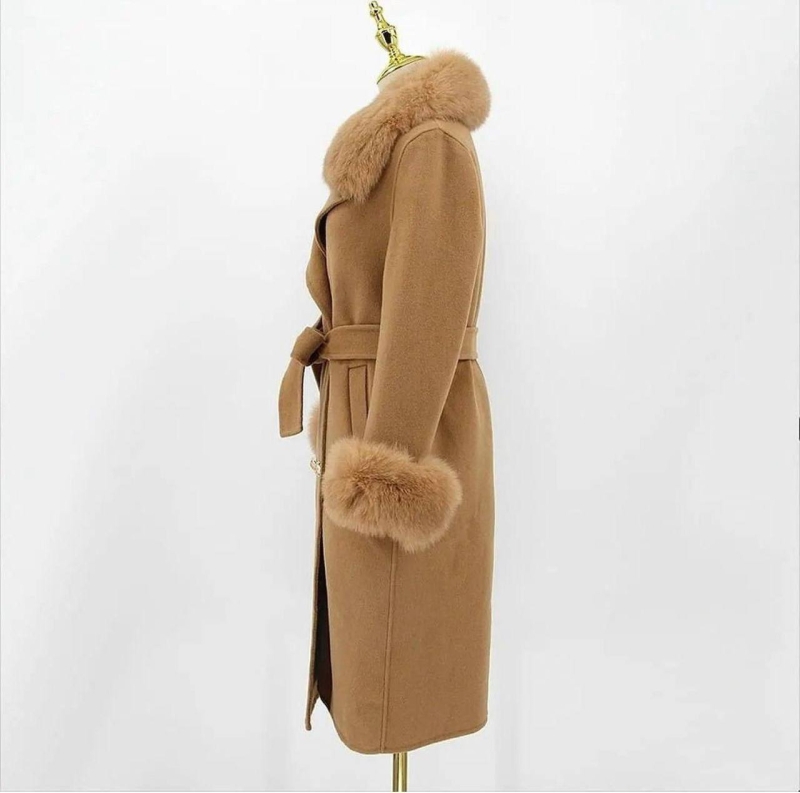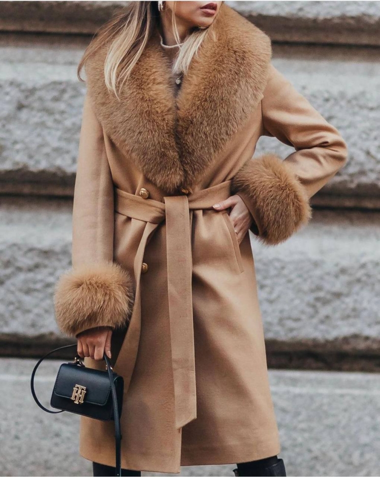palton de cașmir pentru femei cu guler din piele N2314 bej